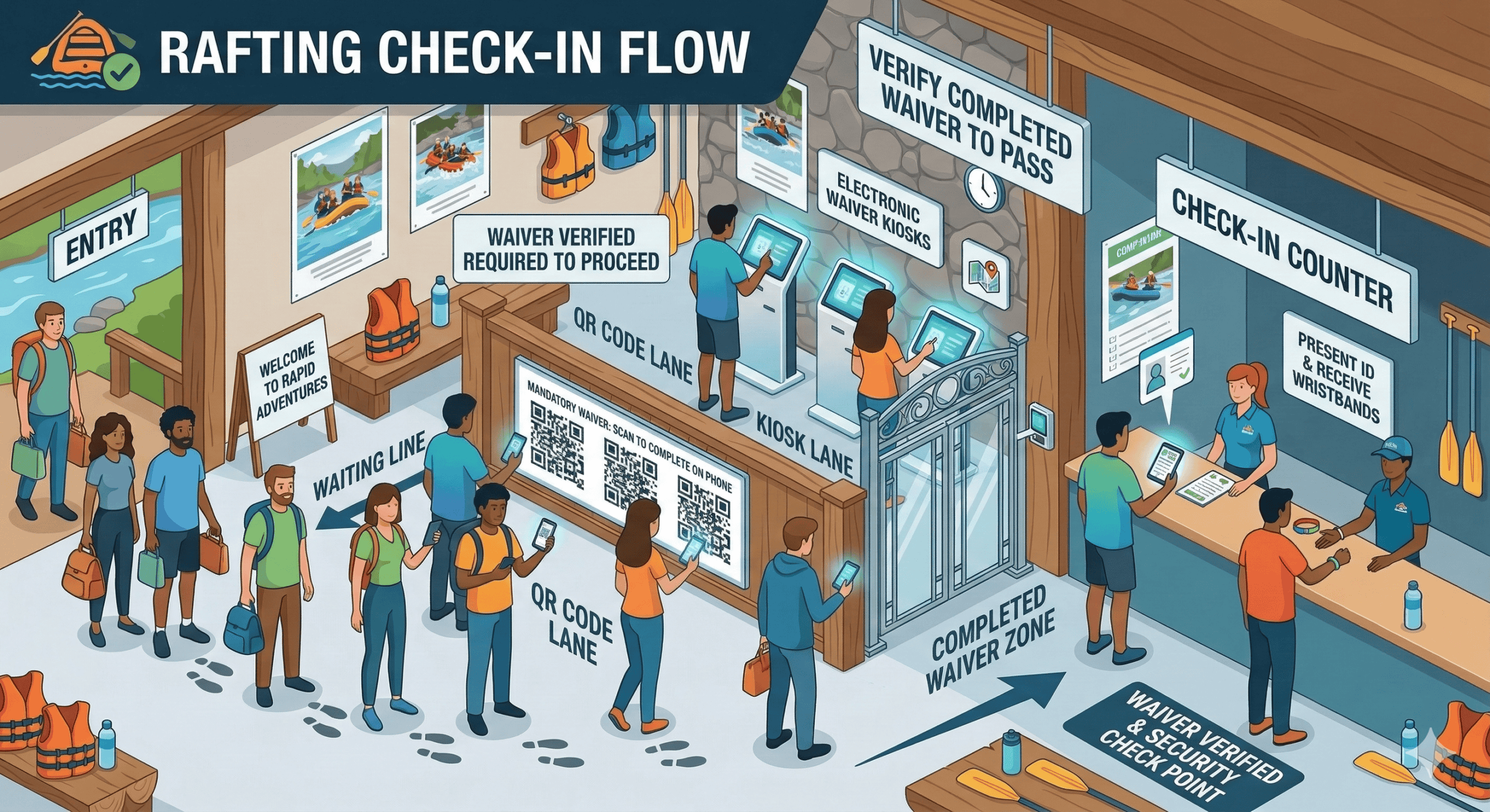 Picture your busiest Saturday morning. A line has formed at the front desk. Your staff member is walking the third person in a row through how to fill out a paper form. The people behind them are already annoyed. And somewhere in that stack of clipboards is a waiver that will never make it into a filing system.