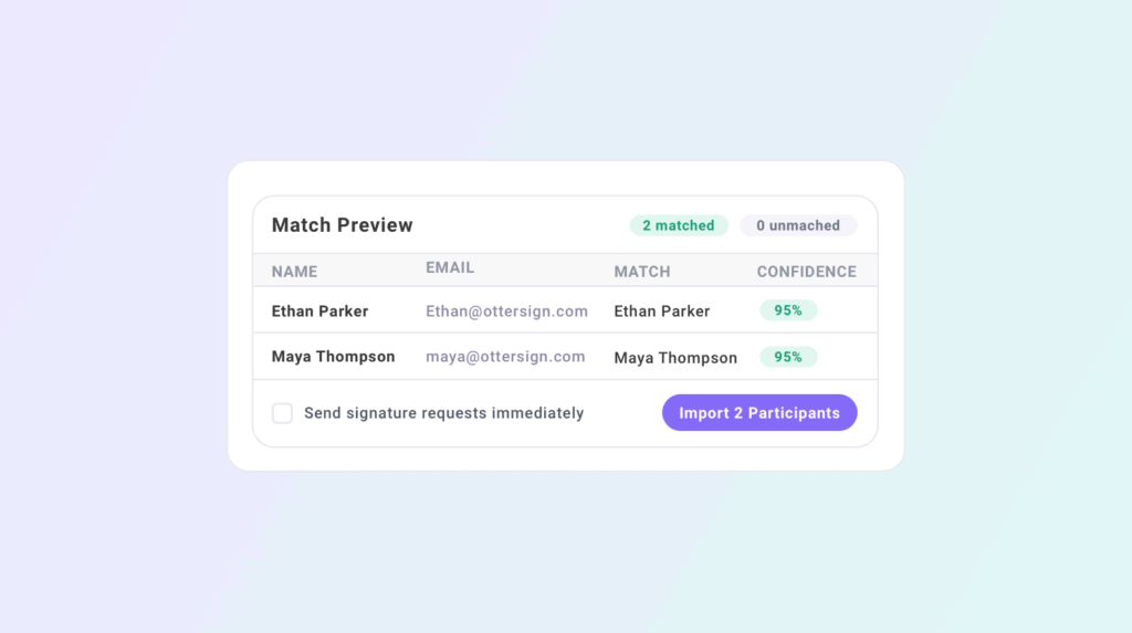 Either way, Trip Manifest shows a match preview before the import is confirmed. Each matched record displays a confidence score so you can see exactly how the system identified the participant and flag any uncertain matches for review before they go into the roster. Once you confirm the import, signature requests can go out to all participants immediately or be held until you are ready.