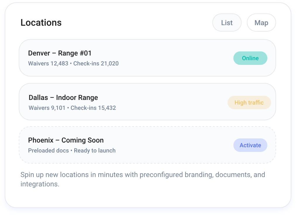 View all locations in map or list mode, with metrics showing usage, waiver volume, check-ins, and performance trends.