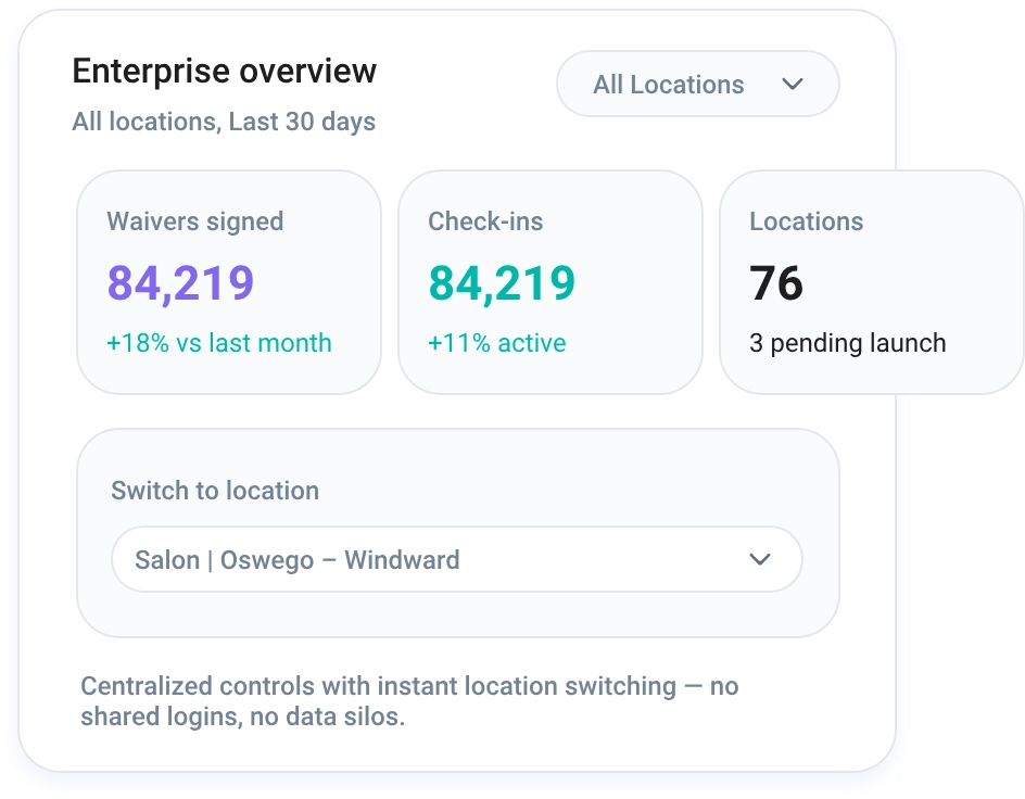 Monitor every location from a single, streamlined dashboard with usage metrics, waiver volume, check-ins, and performance insights.